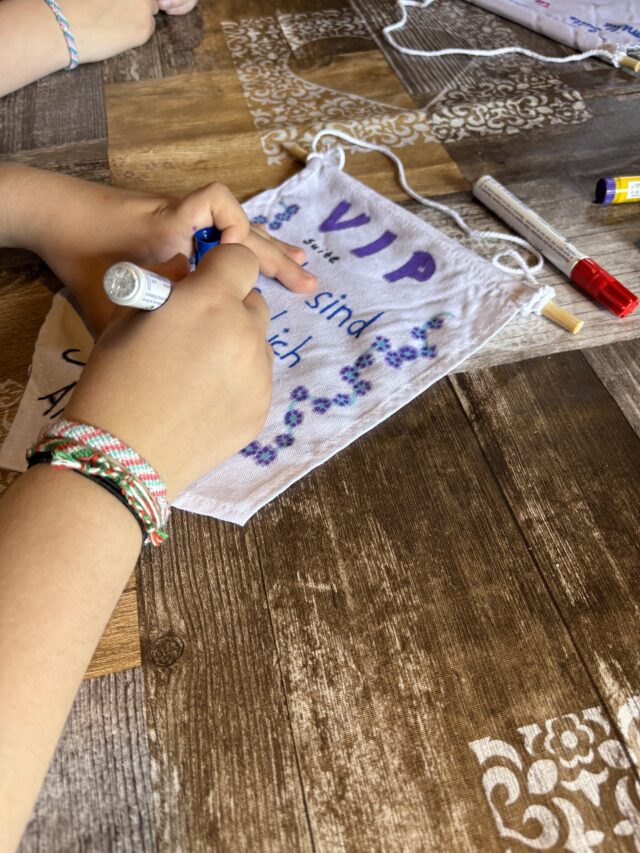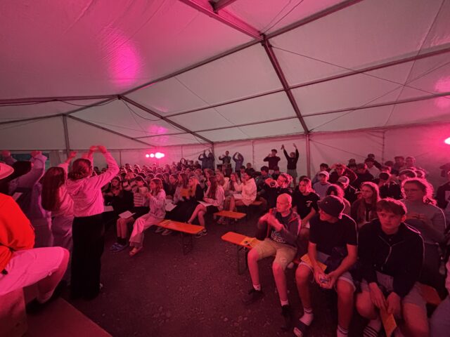 Der erste Tag in Wildflecken neigt sich dem Ende zu, über dem Dorf geht die Sonne unter. Im Abendzelt kommen alle zusammen, um gemeinsam zu singen, den Tag zu verabschieden und letzte organisatorische Hinweise auszutauschen. Mit einem Wunsch für Frieden in der Welt (Hewenu schalom alejchem) gehen alle in ihre Hütten.